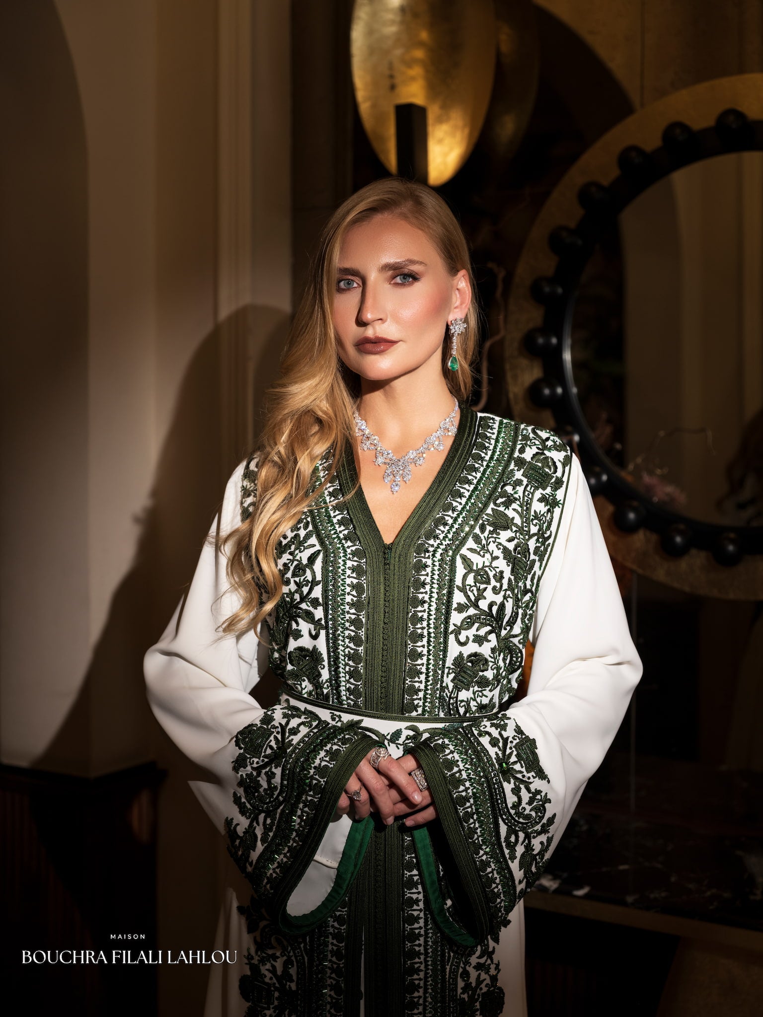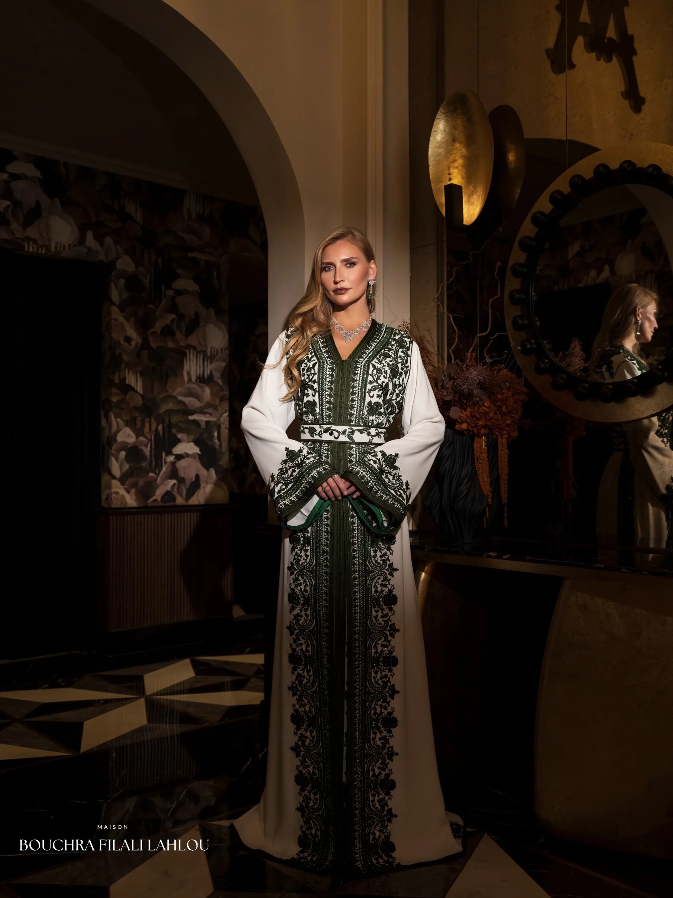 Ivory Deep Green Moroccan Caftan – Emerald Nocturne